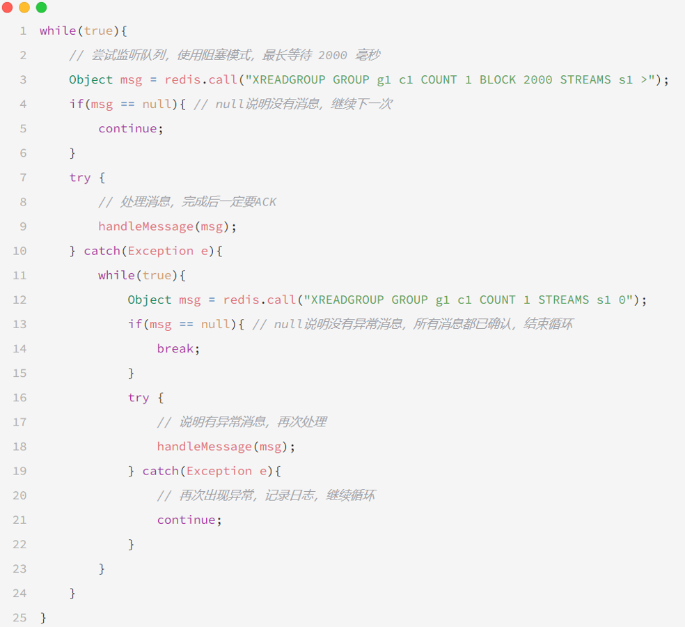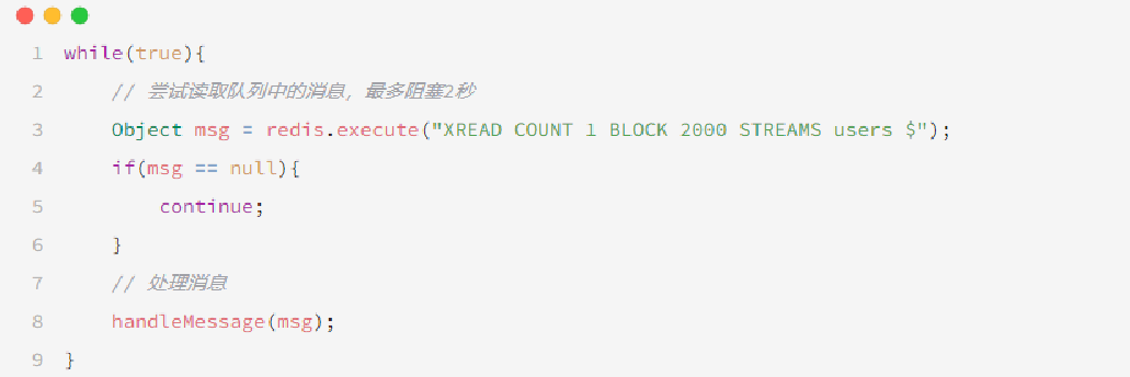- 在业务开发中,我们可以循环的调用XREAD阻塞方式来查询最新消息,从而实现持续监听队列的效果,伪代码如下