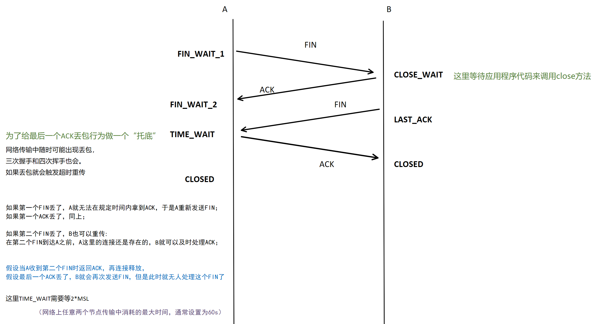 - TIME_WAIT状态的作用:持续2MSL(报文最大生存时间),确保迟到的报文消失,避免端口复用导致的数据错误。