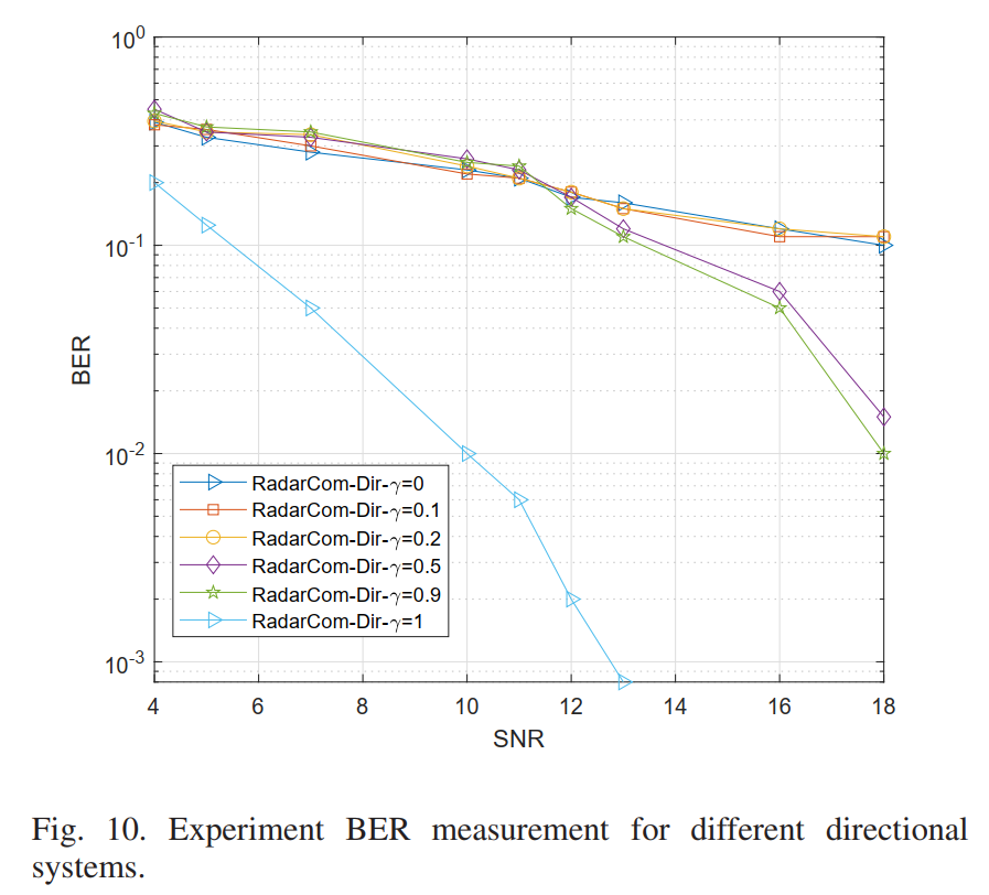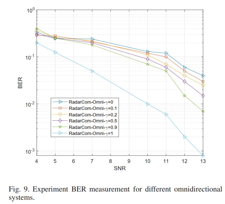 图9的结果支持选择 γ = 0.9 \gamma = 0.9 γ=0.9作为全向系统的工作点:相对于纯通信系统仅损失2-3 dB的SNR,即可实现双功能操作。