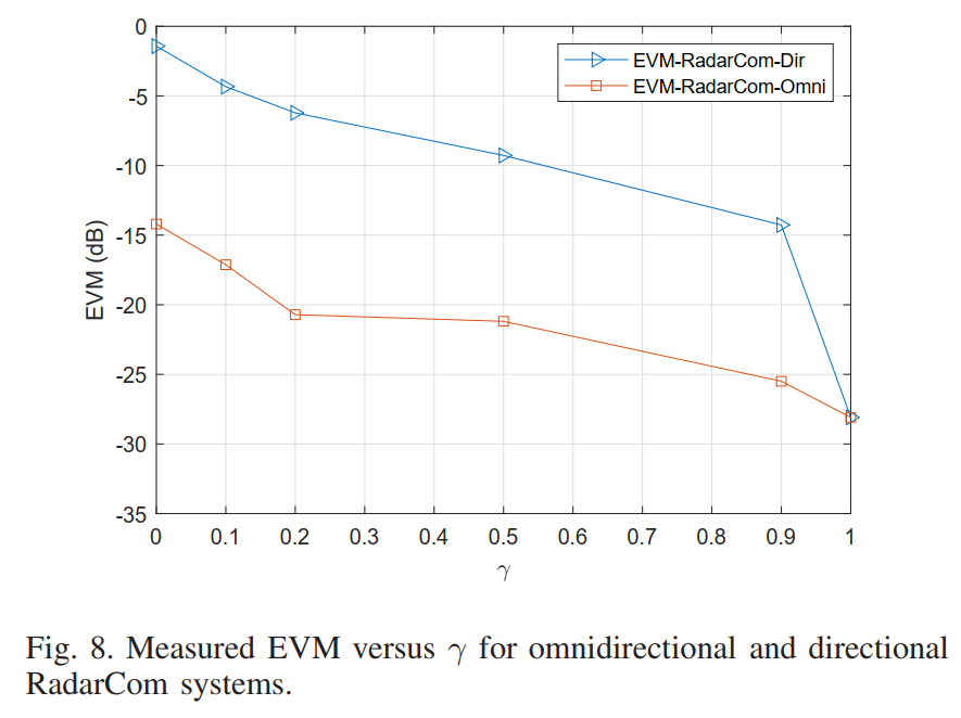 图8定量比较了两种系统在不同 γ \gamma γ值下的通信性能。横轴为权衡因子 γ \gamma γ(0到1),纵轴为EVM(dB)。EVM是衡量调制质量的重要指标,定义为实际接收星座点与理想位置之间偏差的均方根值与理想幅度的比值。较低(更负)的EVM值表示更好的调制质量。
