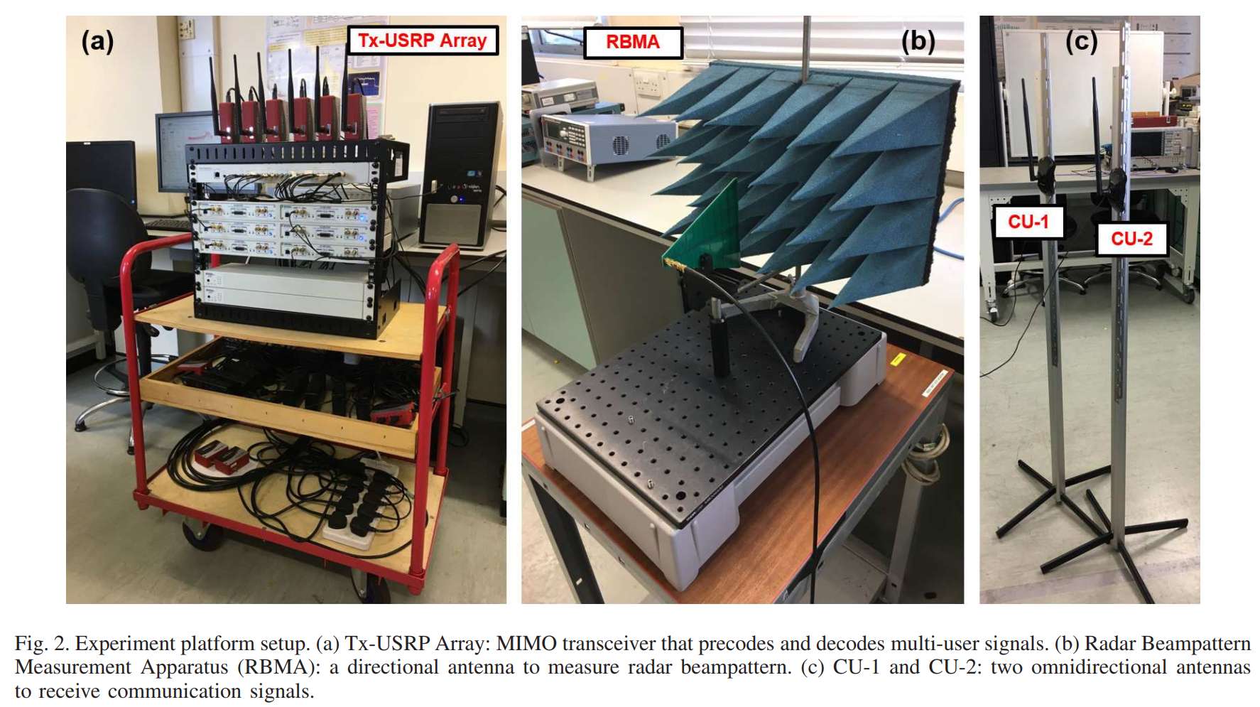 照片©展示了两个通信用户(CU-1和CU-2),每个用户由一根全向天线和连接的USRP设备组成。两个用户被放置在不同位置,模拟多用户MIMO场景中的独立接收端。