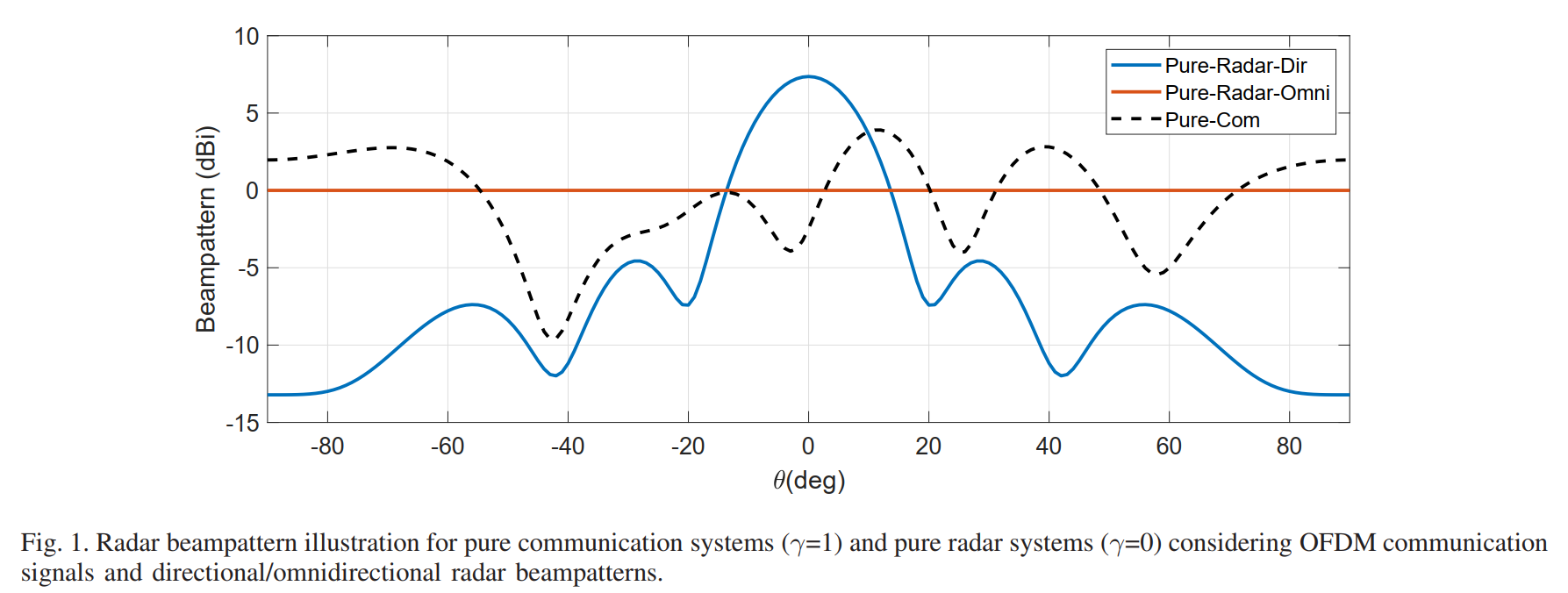 "Pure-Radar-Dir"(纯定向雷达, γ = 0 \gamma=0 γ=0)曲线呈现典型的定向波束图特征。主瓣位于0°方向,增益约为10 dBi,主瓣宽度约为20°。在±40°附近出现第一旁瓣,增益约为2 dBi,主旁瓣比约为8 dB。这种波束图适用于跟踪已知方向的目标,能量集中在目标方向可提高探测距离和精度。