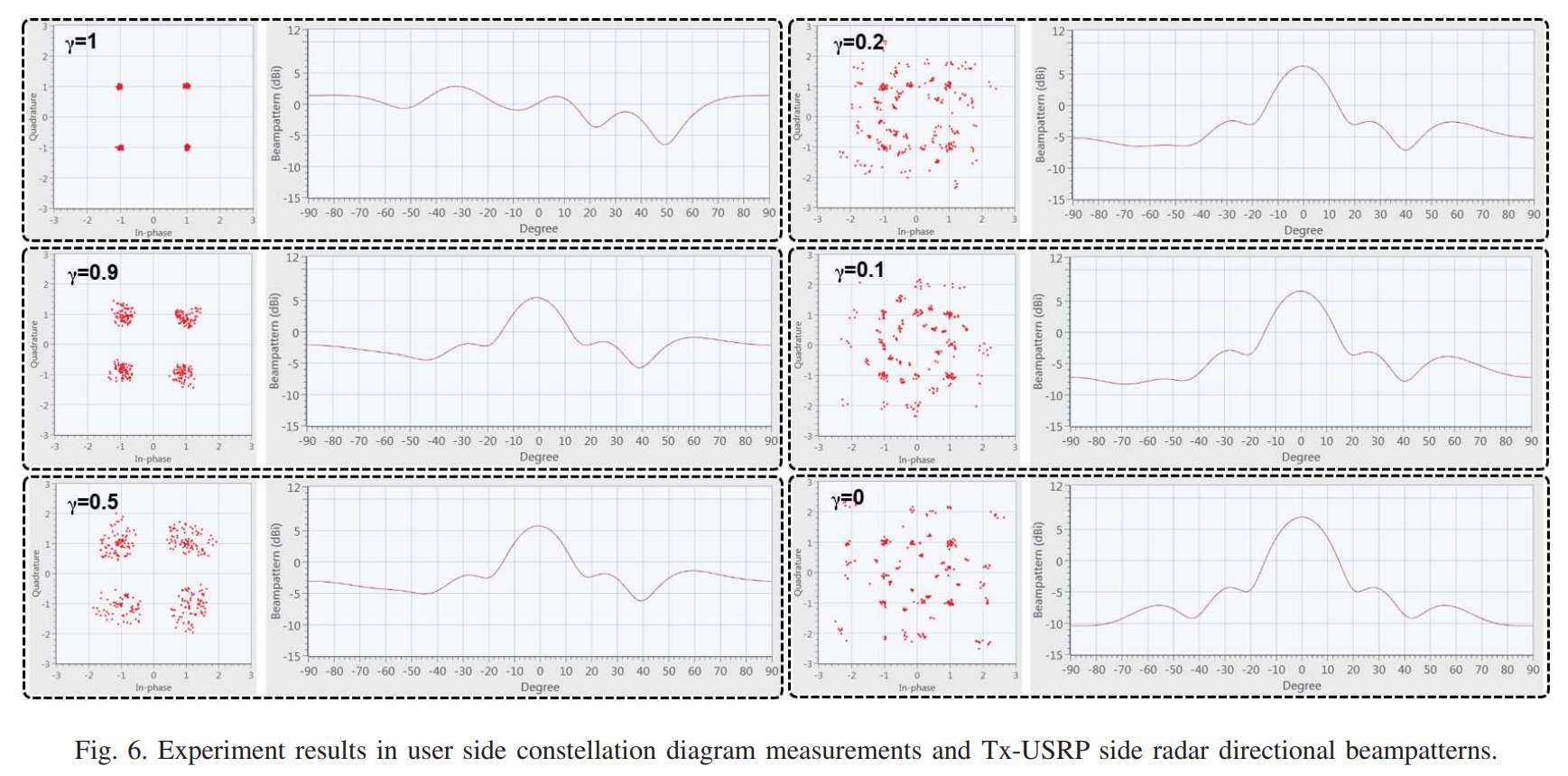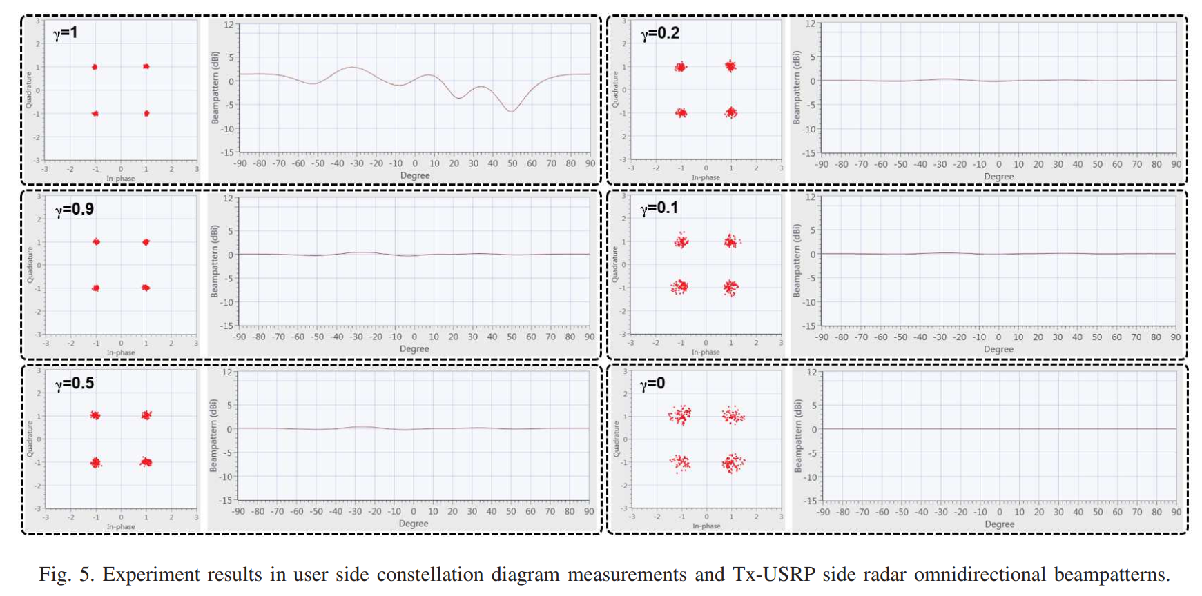当 γ = 1 \gamma = 1 γ=1(纯通信模式)时,星座图与图5中相同(因为纯通信模式不区分全向或定向),四个QPSK星座点清晰分离。波束图同样呈现随机不规则形状,没有定向特性。
