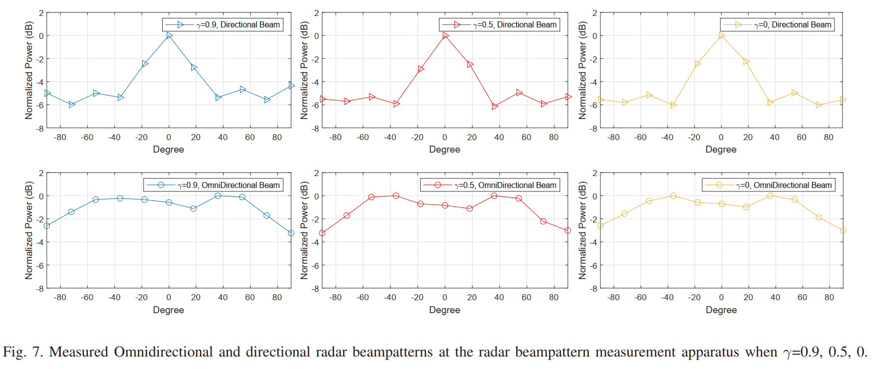 图7展示了通过雷达波束图测量装置(RBMA)实际测量得到的波束图,共包含6个子图,分别对应定向和全向系统在三个 γ \gamma γ值下的结果。所有子图的横轴为角度(-80°到+80°),纵轴为归一化功率(dB)。