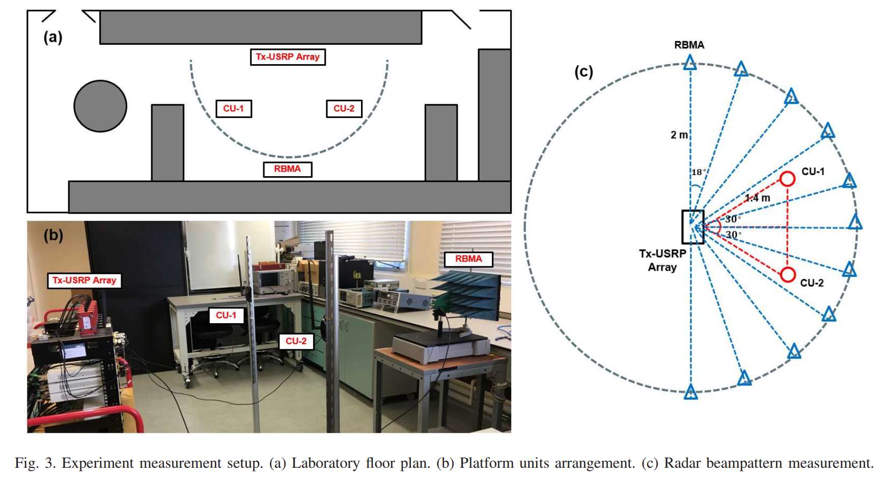 子图©专门展示雷达波束图的测量策略。图中显示RBMA以Tx-USRP Array为圆心、2米为半径进行弧形移动测量。测量点分布在180度范围内,每隔18度取一个测量点,共计10个测量位置。CU-1和CU-2位于距离发射阵列1.4米处,两用户之间的水平间距也是1.4米,形成约60度的角度分离。