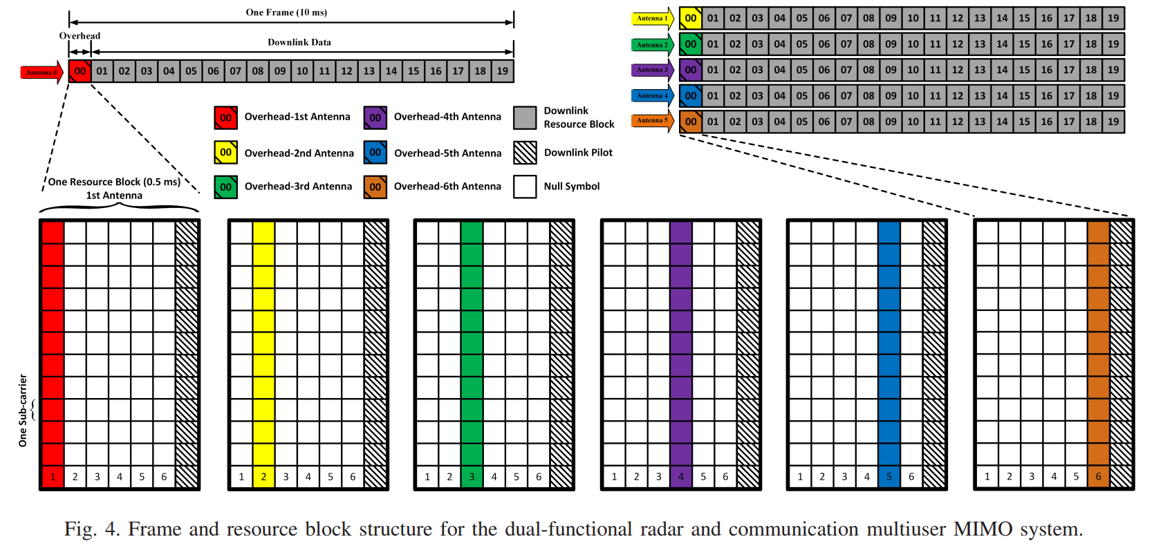 图4展示了系统采用的帧结构设计,这是实现可靠MIMO传输的关键。图的上半部分展示了完整帧结构的时域组织:一帧由20个资源块组成,总时长10 ms(即每个资源块0.5 ms)。资源块编号从00到19,其中资源块00专门用于开销(Overhead),包含MIMO信道估计所需的导频符号;资源块01到19用于下行数据传输。