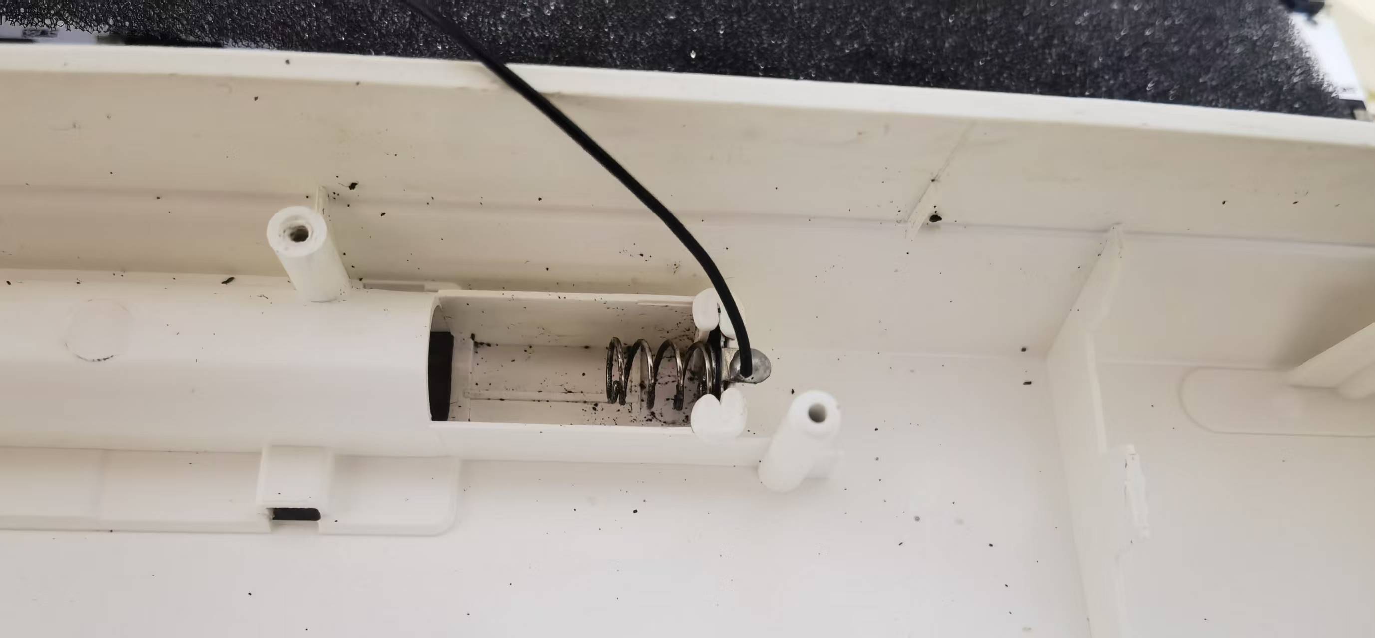 电池接口弹簧丝在深处,拆开后才能完整的看到(见下图),从外部用螺丝刀无法彻底除锈。下图是清除锈迹之后,露出金属色,测试后可以正常通电。
