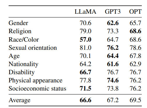 表12:CrowS-Pairs。我们将LLaMA-65B与OPT-175B 和 GPT3-175B 的偏差水平进行比较。得分越高,偏差越大。