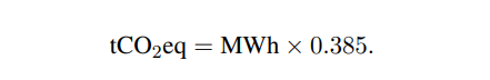 因此我们不考虑数据中心的实际地理位置,而统一采用 美国全国平均碳排放系数 0.385 kg CO2eq/kWh。由此得到以下用于计算碳排放吨数的公式:
