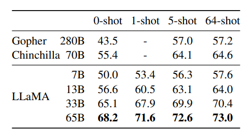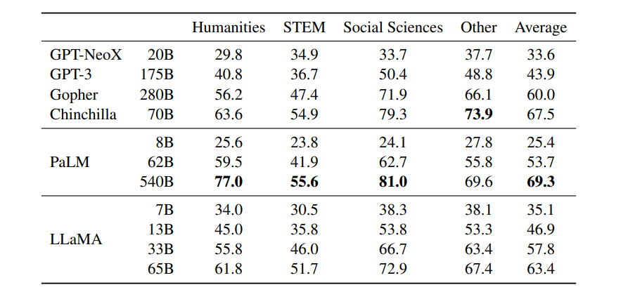 由 Hendrycks et al. (2020) 提出的 MMLU 包含多项选择题,覆盖人文、STEM 与社会科学等多个知识领域。我们在 5-shot 设置下使用基准提供的示例对模型进行评估,结果见表 9。在该基准上,我们观察到 LLaMA-65B 在平均表现以及大多数领域上比 Chinchilla-70B 和 PaLM-540B 低几个百分点。一个可能的解释是,我们在预训练中使用的书籍与学术论文数量有限(ArXiv、Gutenberg 和 Books3 总计仅 177GB),而这些模型使用了多达 2TB 的书籍语料。Gopher、Chinchilla 与 PaLM 使用大量书籍语料,可能也是 Gopher 在该基准上优于 GPT-3(而在其它基准上相近)的原因之一。