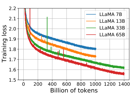 图1:7B、138、338 和 65 模型的训练损失随训练样本数量的变化。LLaMA-33B 和LLaMA-65B 模型使用 1.4T 个样本进行训练,其他较小规模的模型使用 1.0T 个样本进行训练。所有模型均以 4M 个样本的批次大小进行训练。