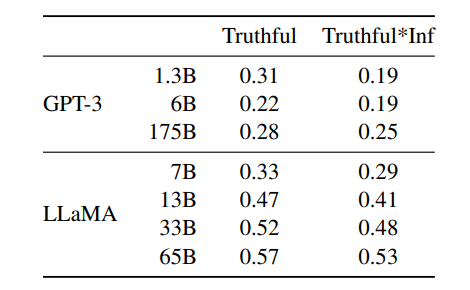 表 14:真实问答。我们报告了通过 OpenAIAPI由专门训练的模型评分的真实答案和真实*信息性答案的比例。我们遭循 Ouyang 等人(2022)中使用的问管提示风格,并报告了同一篇论文中 GPT-3 的性能。