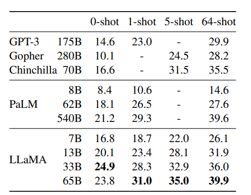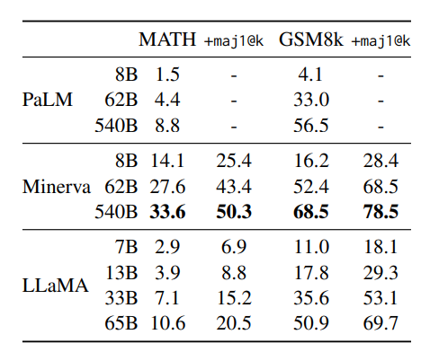 表 7:模型在定量推理数据集上的性能。对于多数投票,我们使用与 Minerva 相同的设置,MATH 数据集的样本数k=256,GSM8k数据集的样本数k=100(Minerva 540B 在 MATH 数据集上使用 k=64,在 GSM8k数据集上使用 k=40)。LLaMA-65B 在 GSM8k 数据集上的性能优于Minerva 62B,尽管它尚未在数学数据上进行微调。