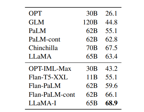 在表 10 中,我们报告指令模型 LLaMA-I 在 MMLU 上的结果,并将其与已有的中等规模指令微调模型比较(如 OPT-IML (Iyer et al., 2022) 和 Flan-PaLM 系列 (Chung et al., 2022))。表中数值来自相应论文。尽管指令微调方法非常简单,我们在 MMLU 上仍达到了 68.9%。LLaMA-I(65B)在 MMLU 上优于现有的一些中等规模指令微调模型,但仍远低于最先进结果,例如 GPT code-davinci-002 在 MMLU 上的 77.4(数据取自 Iyer et al. (2022))。关于 57 个子任务的详细表现见附录表 16。