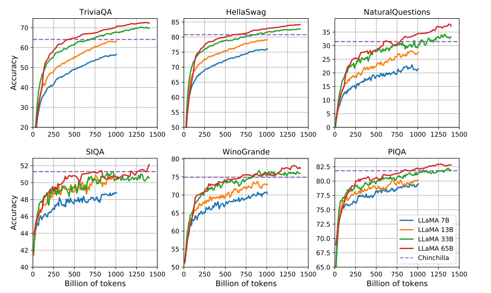在训练过程中,我们追踪模型在若干问答与常识基准上的表现,并在图 2 中报告这些结果。在大多数基准上,性能随训练稳步提升,并与模型的训练困惑度(perplexity)相关(见图 1)。例外包括 SIQA 与 WinoGrande。尤其在 SIQA 上,我们观察到较大的性能波动,这可能表明该基准并不可靠。在 WinoGrande 上,模型性能与训练困惑度的关联不明显:例如 LLaMA-33B 与 LLaMA-65B 在训练过程中表现相近。