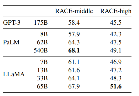 我们在 RACE 阅读理解基准(Lai et al., 2017)上评估模型。该数据集来自为中国初高中生设计的英语阅读理解考试。我们遵循 Brown et al. (2020) 的评估方式,并在表 6 中报告结果。在这些基准上,LLaMA-65B 与 PaLM-540B 具有竞争力,而 LLaMA-13B 则比 GPT-3 高出数个百分点。