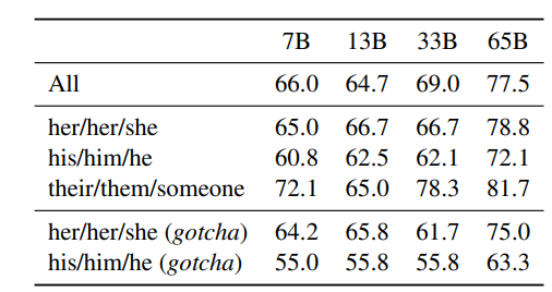 为进一步验证该假设,我们检视针对 "her/her/she" 与 "his/him/he" 的 "gotcha" 样例(即代词性别与职业多数性别不一致但职业为正确答案的句子)。表 13 显示 LLaMA-65B 在这些 gotcha 样例上的错误增多,明确表明其所捕捉到的职业-性别社会偏见。在 "her/her/she" 与 "his/him/he" 两组中均存在性能下降,表明该偏见与性别方向无关地存在。