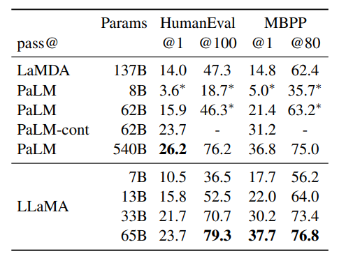 如表 8 所示,在类似参数规模下,LLaMA 优于其他通用模型,如 LaMDA 与 PaLM,这些模型未专门进行代码训练或微调。13B 参数及以上的 LLaMA 均在 HumanEval 与 MBPP 上超过 LaMDA 137B。LLaMA 65B 也优于 PaLM 62B,甚至在 PaLM 训练更长时间的情况下依然如此。表中的 pass@1 是在 temperature=0.1 下采样得到的,而 pass@100 与 pass@80 则是在 temperature=0.8 下获得。我们使用与 Chen et al. (2021) 相同的方法来获得 pass@k 的无偏估计。