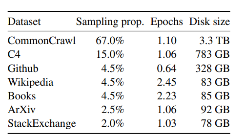表1:预训练数据。用于预训练的数据混合,对于每个子集,我们列出了采样比例、在1.4T个token 上训练时在该子集上执行的 epoch 数以及磁盘大小。在 1T 个 token 上进行的预训练运行具有相同的采样比例。