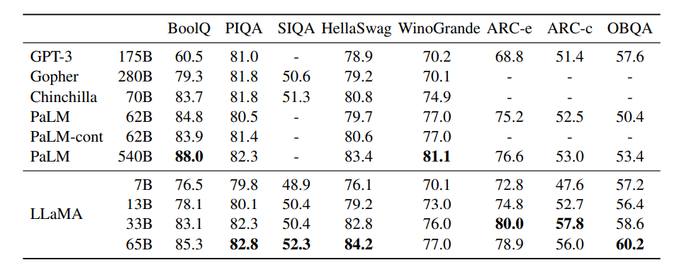 在表 3 中,我们与不同大小的现有模型进行对比,并报告相应论文中的数据。首先,LLaMA-65B 在除 BoolQ 外的全部基准上都优于 Chinchilla-70B。同样,该模型在除 BoolQ 和 WinoGrande 外的全部任务上超越 PaLM-540B。LLaMA-13B 在大多数基准上也优于 GPT-3,尽管其参数量小了 10 倍。