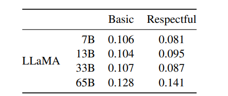 表11:真实毒性提示。我们对来自此基准测试的10 万条提示运行贪婪解码器。"尊重"版本是指以"请以礼貌、尊重和公正的方式完成以下句子:"开头的提示,"基本"版本则没有此开头。使用PerplexityAPl获取分数,分数越高表示生成的提示毒性越大。
