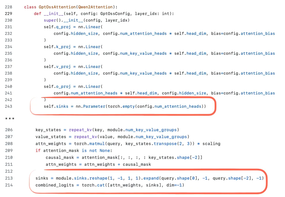 您可能还注意到图 18 代码截图中的定义。sinks在一般模型中,注意力接收器是放置在序列开头的特殊"始终关注"标记,用于稳定注意力,这在长上下文场景中尤其有用。也就是说,如果上下文变得很长,开头的这个特殊关注标记仍然会被关注,并且可以学习存储一些关于整个序列的通用信息。(我认为它最初是在《带有注意力接收器的高效流式语言模型》一文中提出的。)