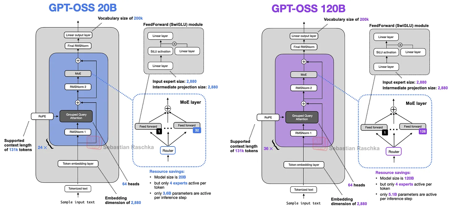 在更详细地讨论架构之前,让我们先概述一下图 1 所示的两个模型:gpt-oss-20b 和 gpt-oss-120b。