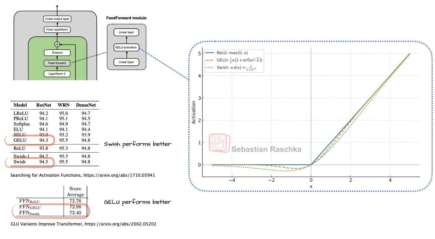 如今大多数架构都使用 Swish 协议。然而,GELU 协议并没有完全被遗忘;例如,谷歌的 Gemma 模型仍然使用 GELU 协议。