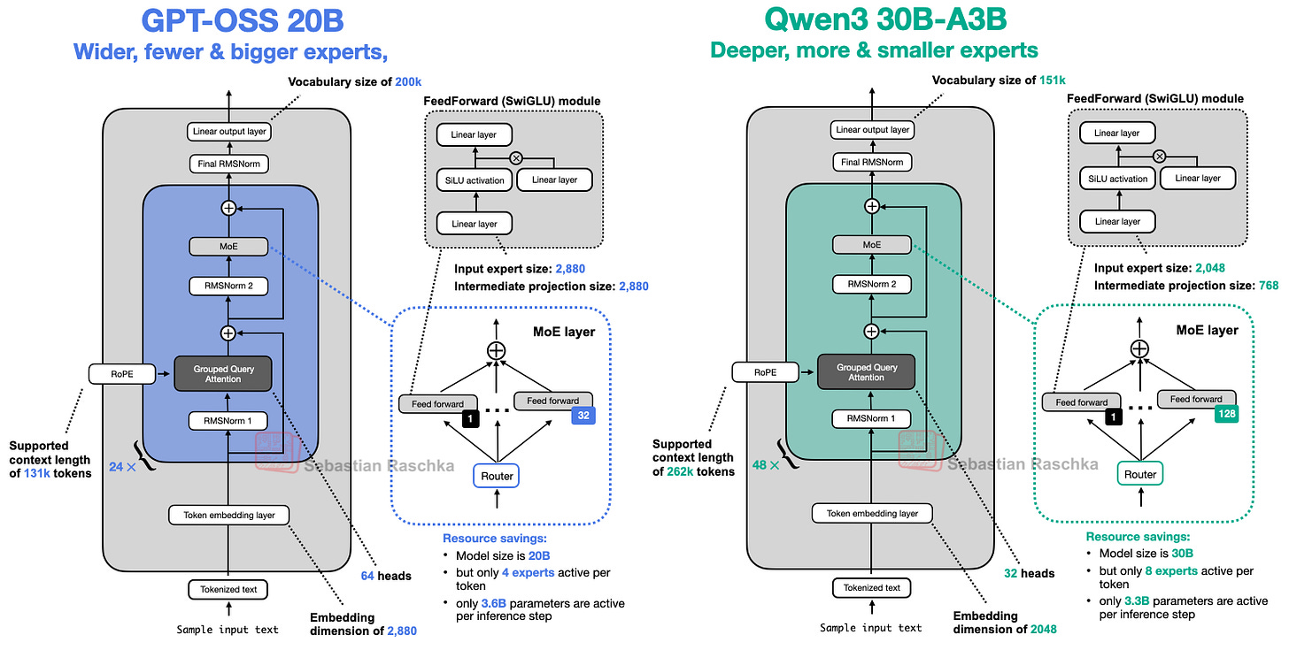 如图所示,gpt-oss 20B 和 Qwen3 30B-A3B 的架构组件非常相似。除了尺寸之外,主要区别在于 gpt-oss 采用了滑动窗口注意力机制(如前文 1.6 节所述,图中未显示),而 Qwen3 没有采用。