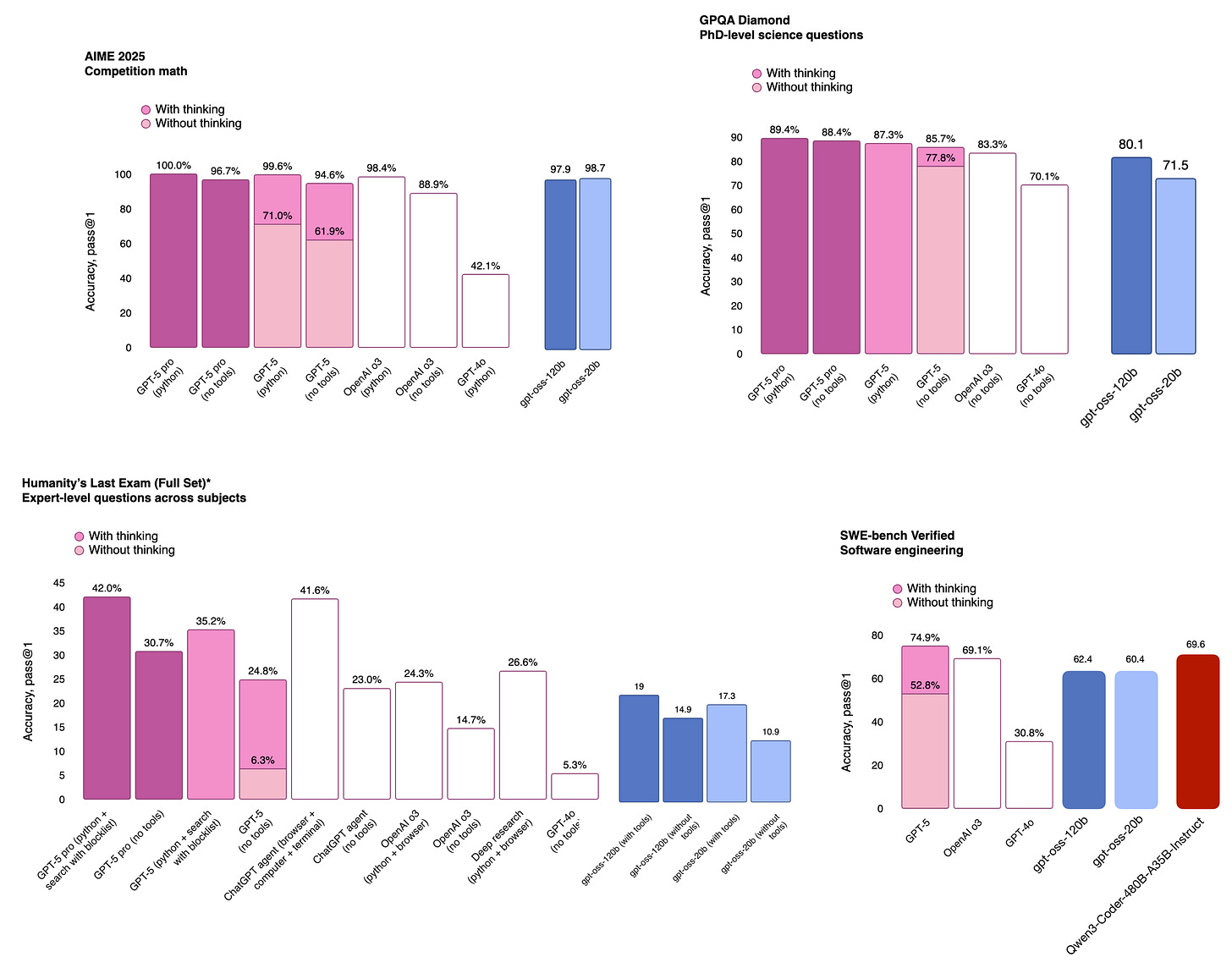 图 24:主要基准测试图表来自 GPT-5 官方 公告。gpt-oss 数据取自官方 模型卡文档和 公告,Qwen3 数据取自官方 Qwen3-Coder 代码库。