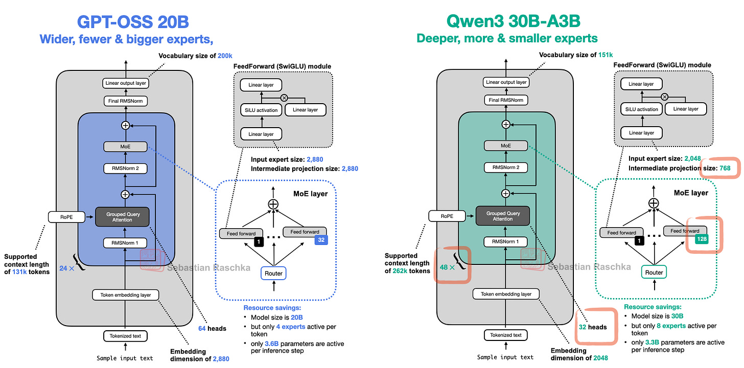 图 16:并排的两种 gpt-oss 架构,其中较大的 120B 模型仅扩展了 transformer 模块的数量和专家的数量。