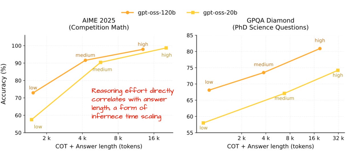 图 21:gpt-oss 模型在不同推理努力下的响应长度和质量( 模型卡片中的注释图)