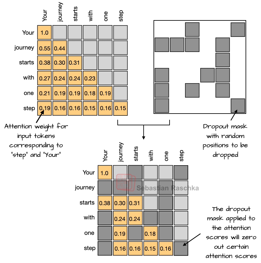 Dropout【5】 是一种传统的过拟合防止技术,它通过在训练过程中随机"丢弃"(即置零)一部分层激活值或注意力分数(图 3)来实现。然而,Dropout 在现代的层级模型中很少使用,GPT-2 之后的大多数模型都已弃用它。