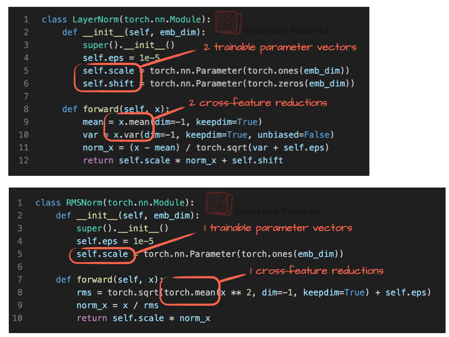 图 12:LayerNorm 和 RMSNorm 的代码实现表明 RMSNorm 在计算上更简单。