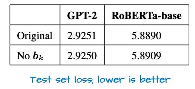 图 19:来自https://arxiv.org/pdf/2302.08626的表格,显示了使用和不使用偏置单元从头开始训练模型时的平均测试损失。