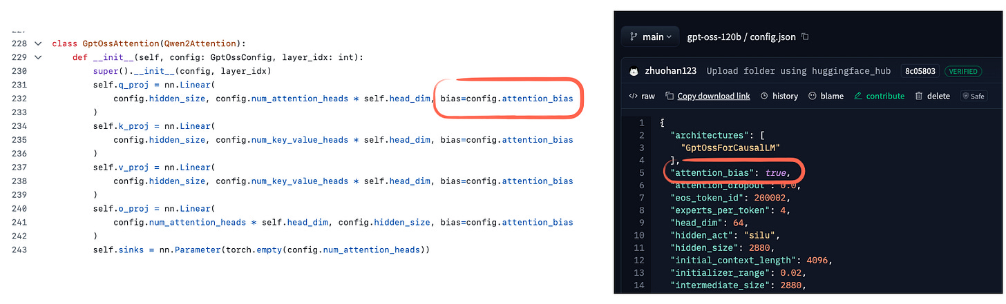 图 18:gpt-oss 模型在注意力层中使用偏置单元。参见 此处的代码示例。