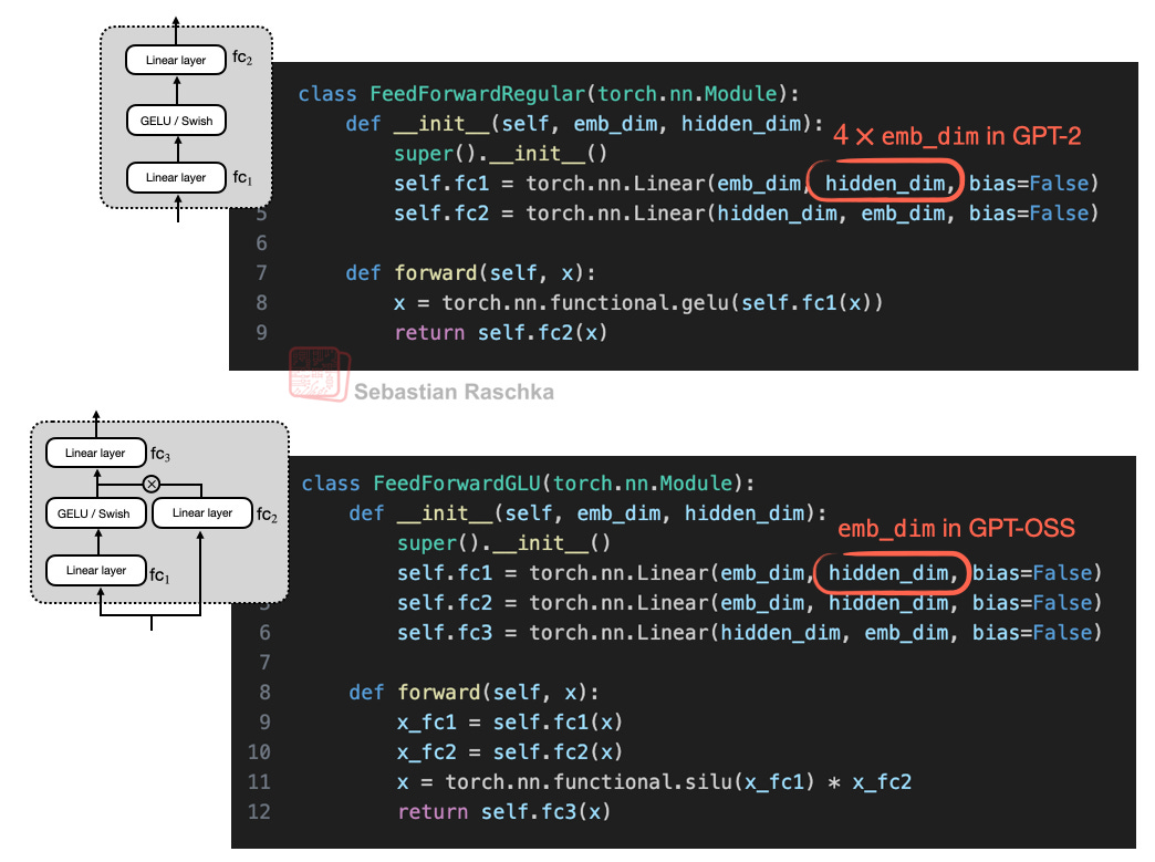 图 7:常规前馈模块(上)和 SwiGLU 变体(下)并排显示。请注意,Swish 函数在 PyTorch 中被实现为"silu"。