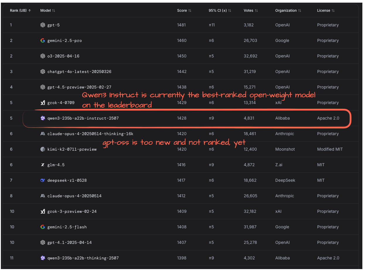 这些模型目前还比较新,尚不具备独立基准测试的条件。查看LM Arena排行榜,我发现gpt-oss尚未上榜。因此,根据LM Arena用户的反馈,Qwen3-Instruct目前仍然是最佳的开源模型(图22)。