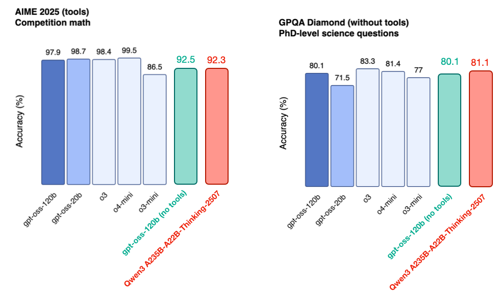 图 23:主要基准测试图表来自 gpt-oss 官方 公告。"无工具"gpt-oss-120b 数据取自官方 模型卡文档,Qwen3 数据取自官方 Qwen3 代码库。