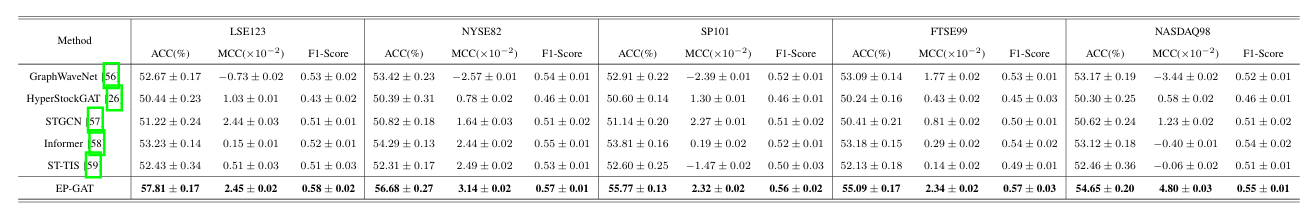 · 分类准确率(ACC):EP-GAT 平均达 56% 以上,较基线模型平均提升 7.61%,在波动剧 烈的纳斯达克市场,准确率更是突破 58%;