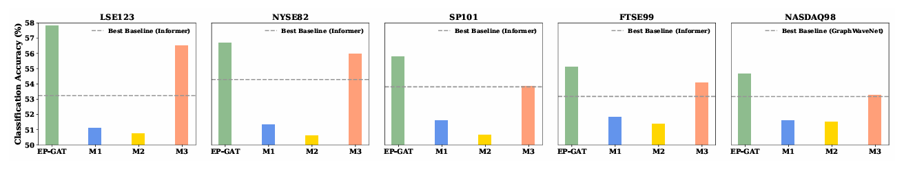 团队在伦敦证交所(LSE123)、纳斯达克(NASDAQ98)、标普 100(SP101)等 5 大真实数据集上测试,EP-GAT 的表现全面超越 5 类基线模型(含 GNN、Transformer 类主流方法):