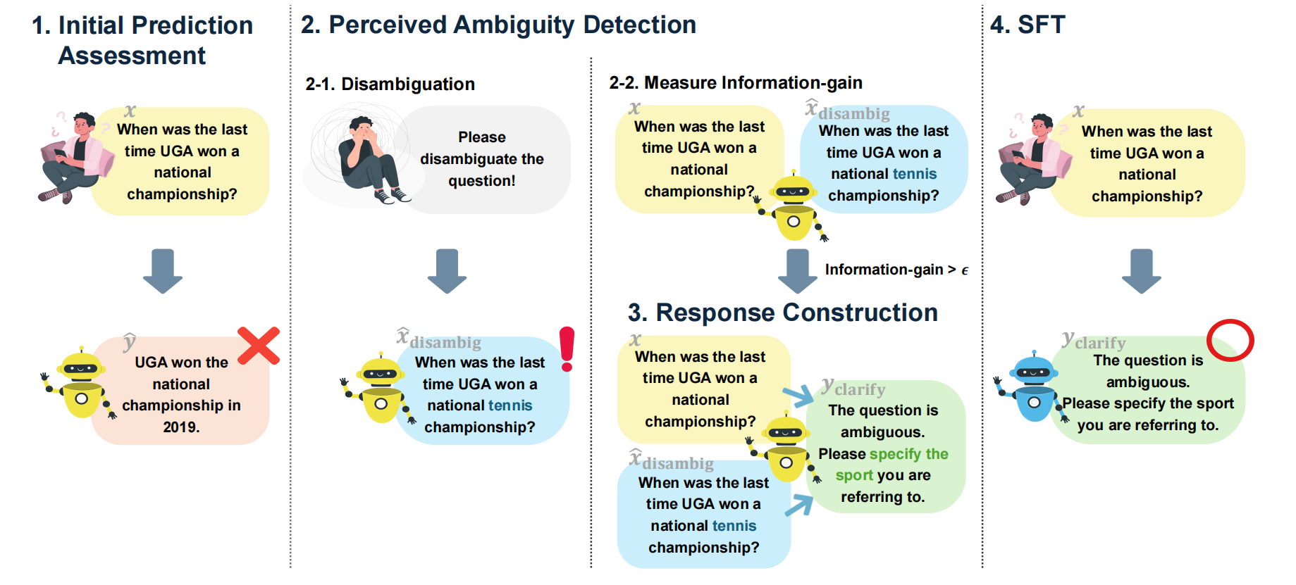 为解决这些问题,作者提出感知模糊性对齐(APA)方法,通过利用查询的感知模糊性,使模型能够显式处理模糊查询。具体而言,作者设计了一个代理任务,引导模型利用其内在知识对给定查询进行自消歧。随后,将消歧过程中获得的信息量化为模型感知输入模糊程度的隐性指标。对于选定的模糊查询及其消歧结果,模型会生成针对模糊性的澄清请求。最终,模型通过训练能够对模糊查询作出显式澄清请求。