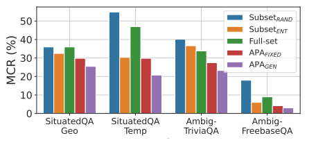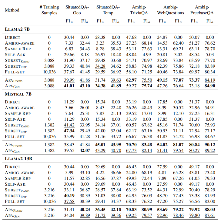 - 训练方法:由于缺乏可直接比较的前期研究,作者将APA与经过微调的基线模型进行对比,这些基线模型均使用领域内训练集进行训练。作者比较了应用完整训练集的 FULL-SET 方法。此外,作者还比较了两种利用与 APA 相同数量训练样本的变体:subset_rand 采用随机选取的子集进行训练,该子集中包含等量的模糊样本和明确样本;subset_ent 则以模型对模糊查询预测的熵值作为不确定性度量。前者选择具有最高熵值的模糊样本,后者则随机选取明确样本。