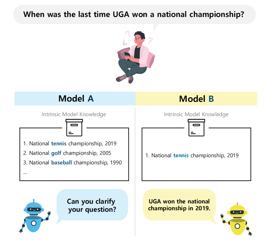 - 模型感知到的模糊程度会因其知识储备而异。以下图所示场景为例:初始查询"全国锦标赛"具有多重含义,可能指"全国网球锦标赛"或"全国高尔夫锦标赛"。若模型掌握所有可能含义的全面知识,就能识别出查询的模糊性(图1左)。但若知识储备有限,模型就会误判为明确查询(图1右)。因此,模型如何解读模糊性取决于其知识范围,我们将其定义为感知模糊性。