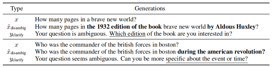 下表展示了从查询 x x x 生成的消歧 x ^ disambig \hat{x}{\text {disambig }} x^disambig 和澄清请求 y c l e a r i f y y{clearify} yclearify 的示例。我们可以观察到,模型利用其内在知识(例如,1932年版的书籍)生成了关于查询的事实规范。此外,给定 x x x 和 x ^ disambig \hat{x}_{\text {disambig }} x^disambig ,模型成功生成了一个澄清请求,特别提到了导致歧义的因素(例如,哪个版本)。
