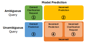 - 歧义性检测 ( F 1 a F1_a F1a):当输入信息存在歧义 时,模型应能识别并生成相应的澄清请求。然而,模型可能对澄清请求存在预测偏差。基于这些考量,作者采用F1分数评估模型的模糊性检测能力,该指标同时反映精确率 ① ① + ⑤ \frac{①}{①+⑤} ①+⑤① 和召回率 ① ① + ② \frac{①}{①+②} ①+②① 。
