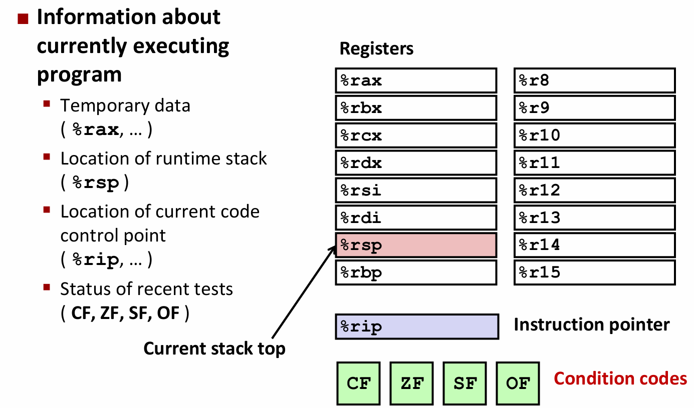 - 程序计数器(PC):指向下一条指令地址,x86-64中称为RIP。