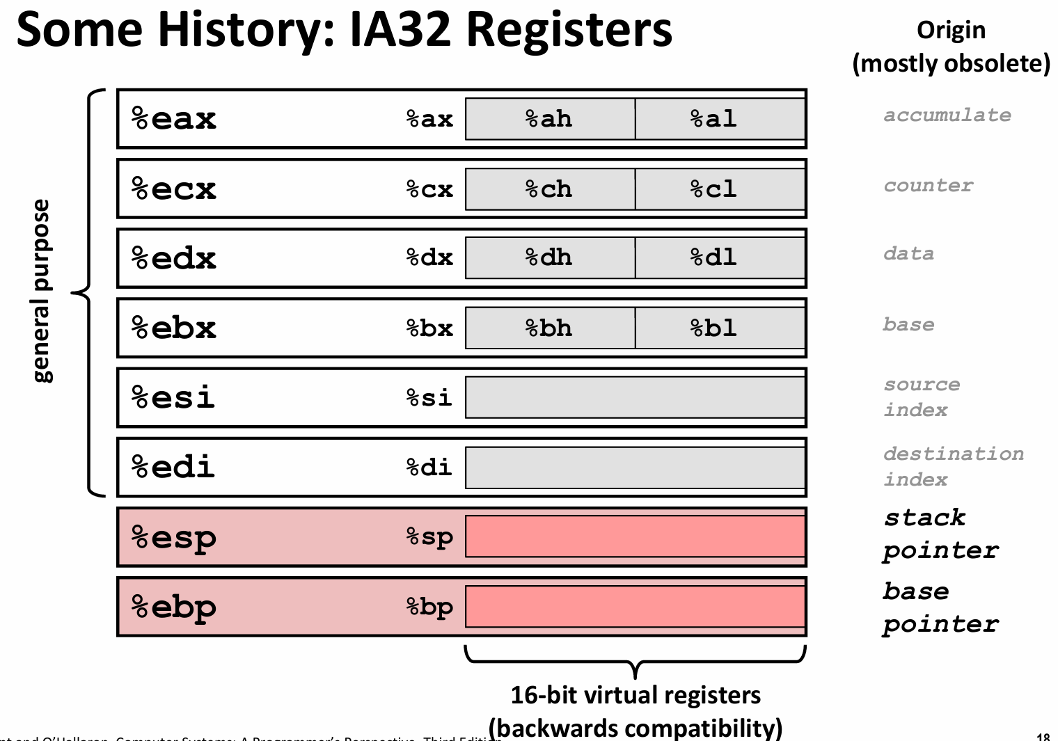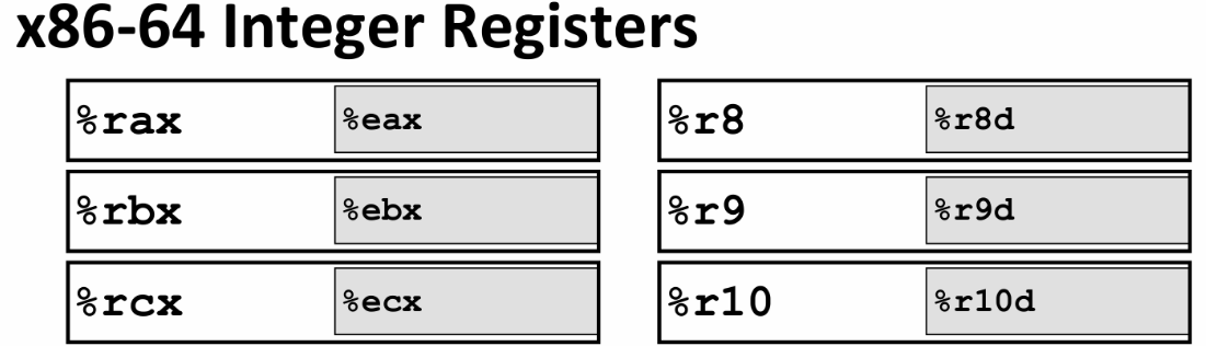 %rax(64位)→%eax(低32位)→%ax(低16位)→%ah(高8位)[IA32支持 x86-64不支持]→%al(低8位)。