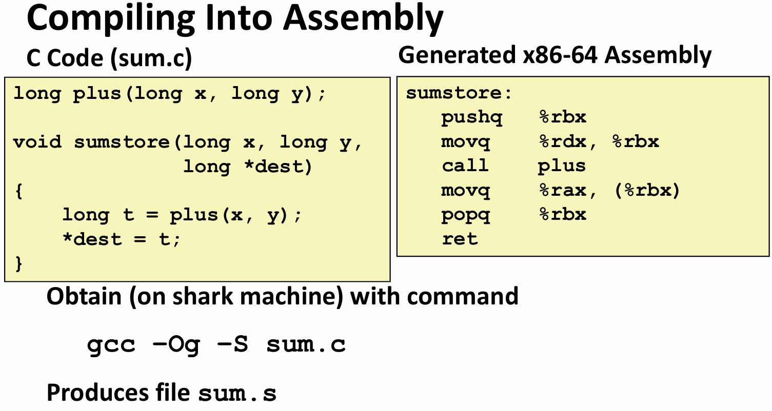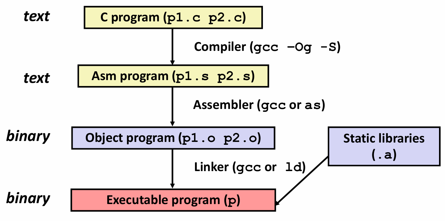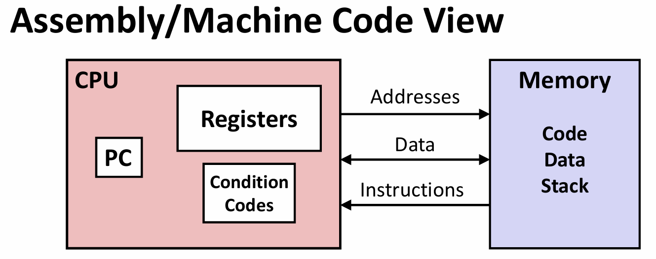 - 架构(ISA):编写正确机器/汇编代码所需理解的部分,如指令集、寄存器机器码:处理器执行的字节级程序。