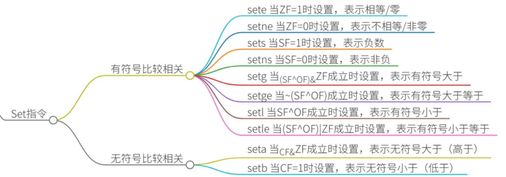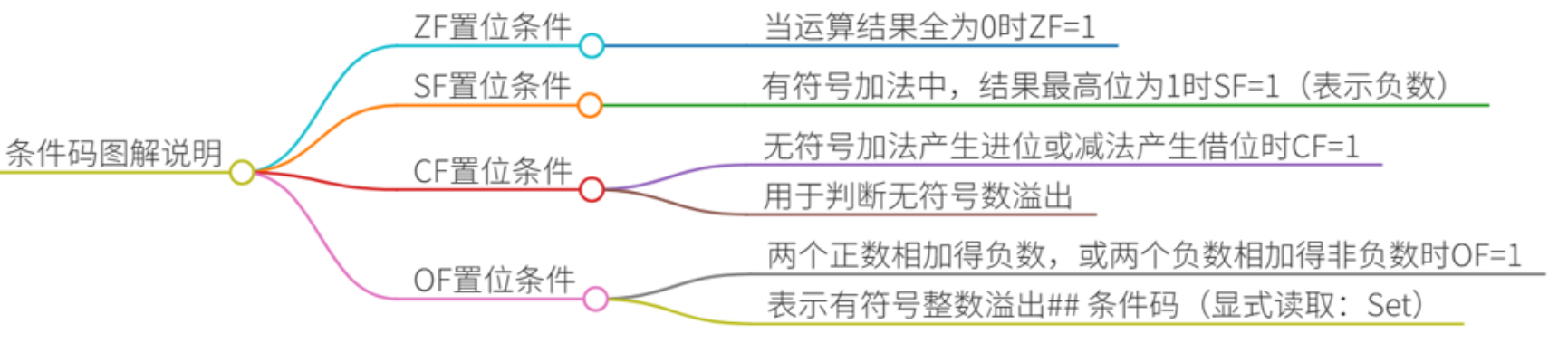 | >- 说明:ZF(零标志)、SF(符号标志)、OF(溢出标志)、CF(进位标志)为 x86 架构下的条件码(状态标志位);^ 表示异或、& 表示逻辑与、| 表示逻辑或、~ 表示取反。 |